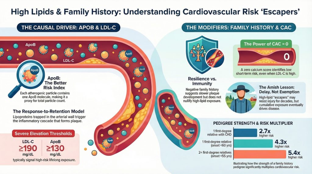 Yet clinical practice repeatedly reveals a puzzling subgroup of “escapers”: individuals with very high LDL-C or ApoB who remain free of myocardial infarction, clinically manifest coronary disease, or detectable coronary calcification well into midlife or later. This creates a central question in preventive cardiology: can a strongly negative family history of coronary disease, especially one spanning multiple generations without premature events, meaningfully offset the expected hazard associated with high ApoB exposure? The most defensible answer is nuanced. Negative family history appears to act as a favorable risk modifier and may identify individuals with slower plaque development or greater vascular resilience, but it does not nullify the biologic effect of lifelong exposure to atherogenic particles. High ApoB remains causally upstream; family history modifies the expression of that burden rather than abolishing it.1-3 (Lipid Journal)