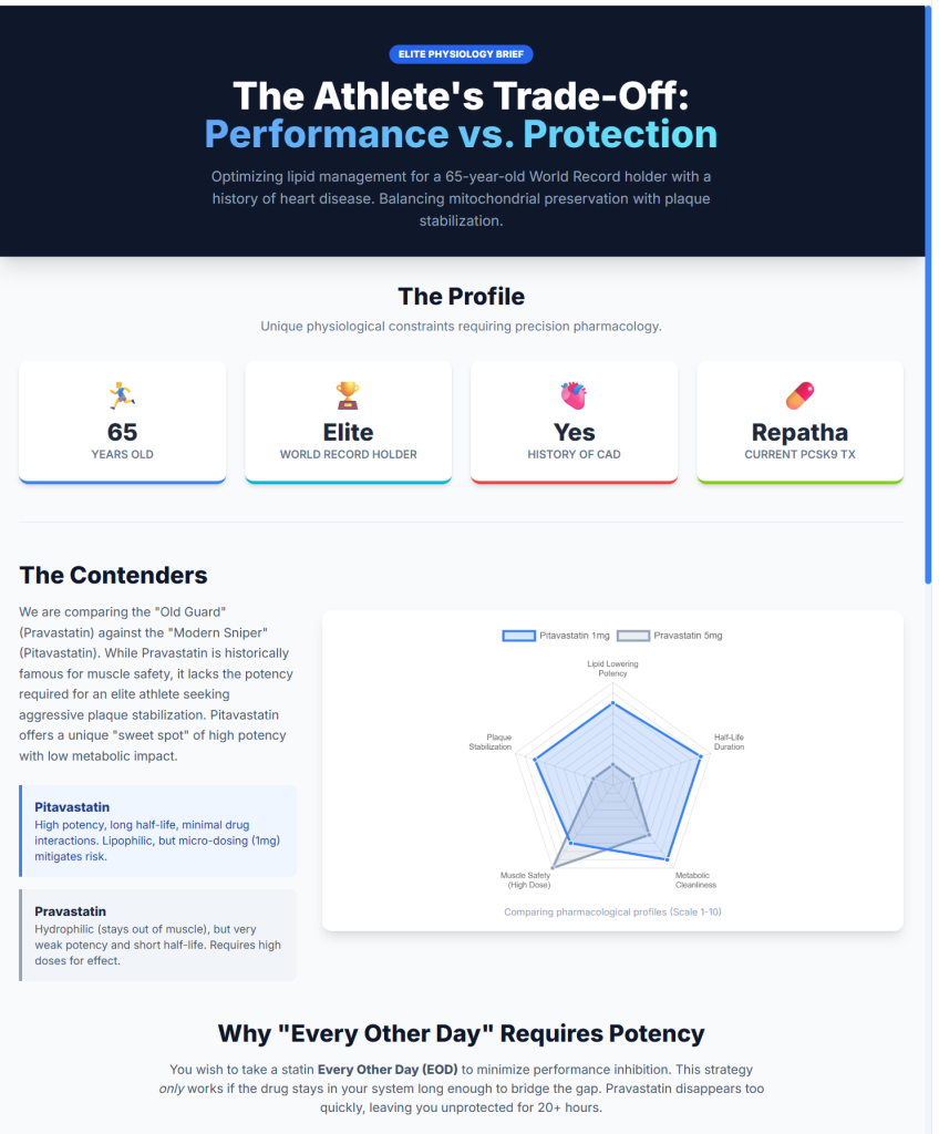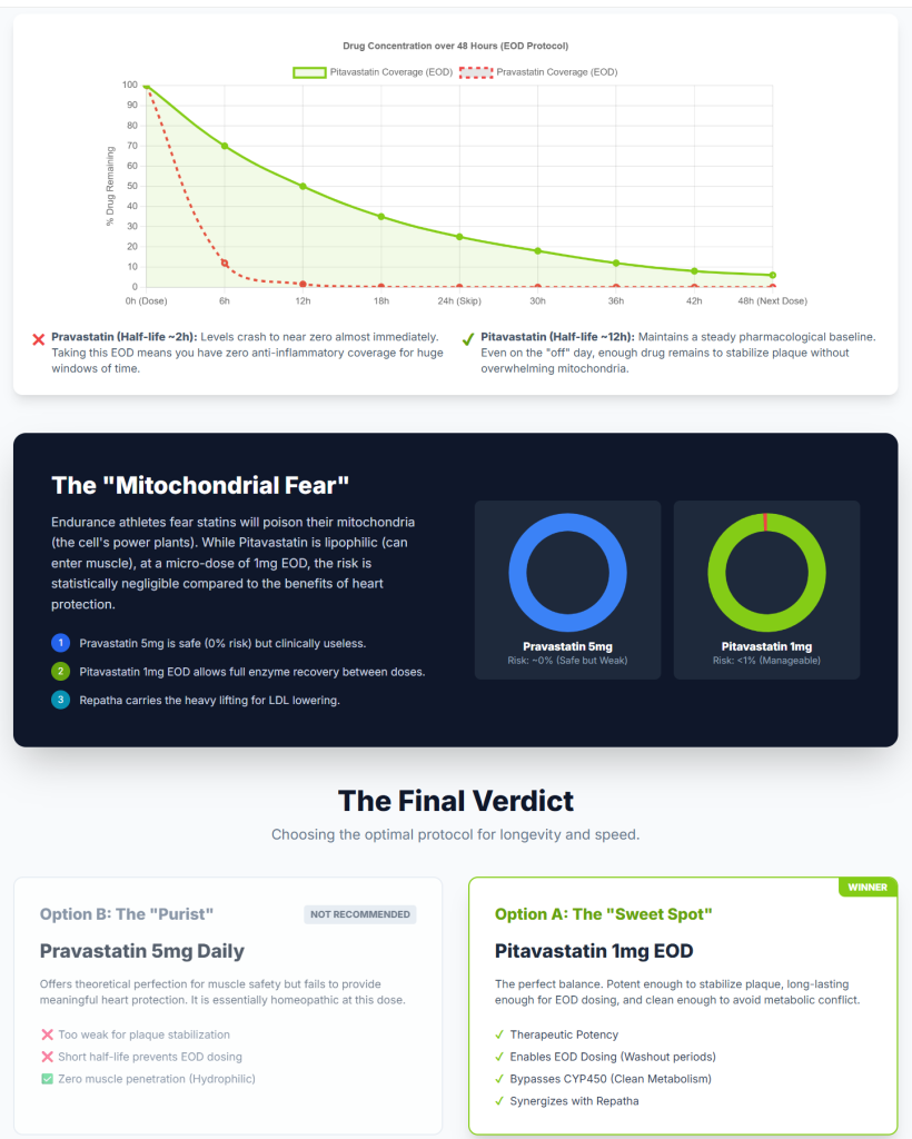 Athlete framing: pitavastatin can be a “small pill, meaningful LDL effect” option—useful when you want LDL/ApoB down without escalating to large statin doses. (Whether that translates into better tolerability is individual.)