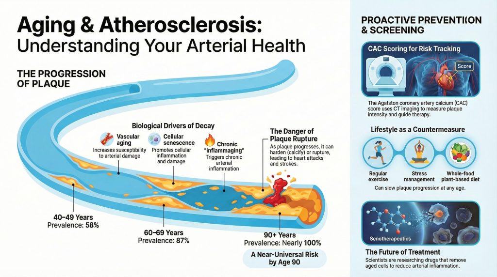 As we age, our immune system changes—a phenomenon called immunosenescence. It becomes less efficient at resolving inflammation, allowing plaque to persist and grow. Persistent, low-level inflammation (“inflammaging”) contributes to the worsening of atherosclerosis over time.