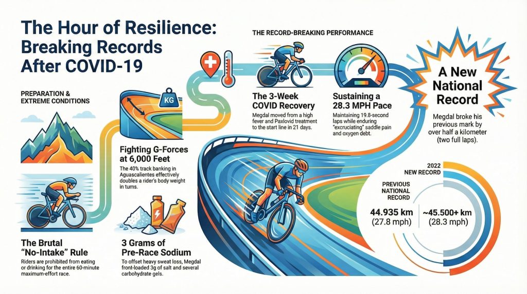 On September 27, 2022, I competed at the world cycling track championships in Carson, CA, to attempt a 2-kilometer world championship race. Unfortunately, I had a terrible race and, in the process, contracted COVID. I was probably infected at the time that I was racing, which could account for my poor performance. To make matters worse, I was also planning to attempt a world record in the hour time trial in Aguascalientes, Mexico on October 17th, just three weeks away. How could I do this after such a poor performance only three weeks earlier?!