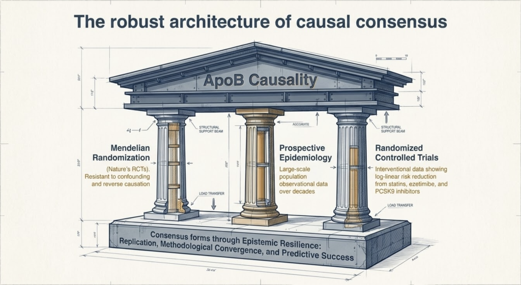It is a common misconception that scientific consensus is produced by a single definitive experiment. In reality, consensus emerges through the accumulation of ‘epistemic resilience’ via multiple independent processes. First, replication: the same association must be observed in different populations, by independent researchers, using methodologically distinct approaches. Second, convergence of methods: when genetic studies (nature’s experiments), epidemiological cohorts (observational data), and RCTs (interventional data) converge on the same directional finding, the probability of systematic error across all domains simultaneously approaches a very low threshold. Third, predictive success: a causal model must not only explain existing data but successfully predict the outcomes of novel interventions. The consistent reduction in cardiovascular events across hundreds of trials using diverse LDL-lowering mechanisms constitutes powerful prospective validation of the causal model.