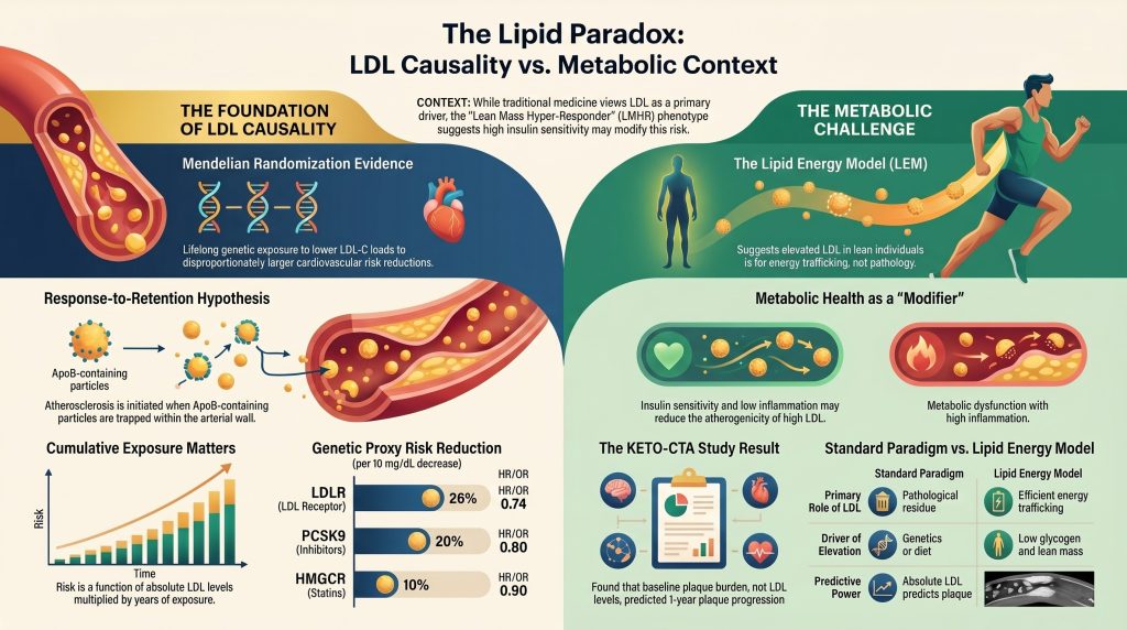 The identification of low-density lipoprotein (LDL) as a causal agent in atherosclerotic cardiovascular disease (ASCVD) represents one of the most rigorously tested paradigms in modern medicine. This conclusion is supported by converging evidence from lifelong genetic exposure studies using Mendelian randomization, large-scale prospective epidemiology, and randomized controlled trials (RCTs). In recent years, an intellectual movement has emerged, primarily within the ketogenic and low-carbohydrate communities, challenging the universality of this causal relationship. This movement is exemplified by the ‘Lean Mass Hyper-Responder’ (LMHR) phenotype and the associated ‘Lipid Energy Model’ (LEM), which propose that in individuals with high insulin sensitivity and lean body mass, elevated LDL-C may not carry equivalent pathological implications. This paper analyzes the epistemological landscape of this debate, evaluates the strength of evidence on both sides, and proposes a framework for productive clinical communication with metabolically informed skeptics.