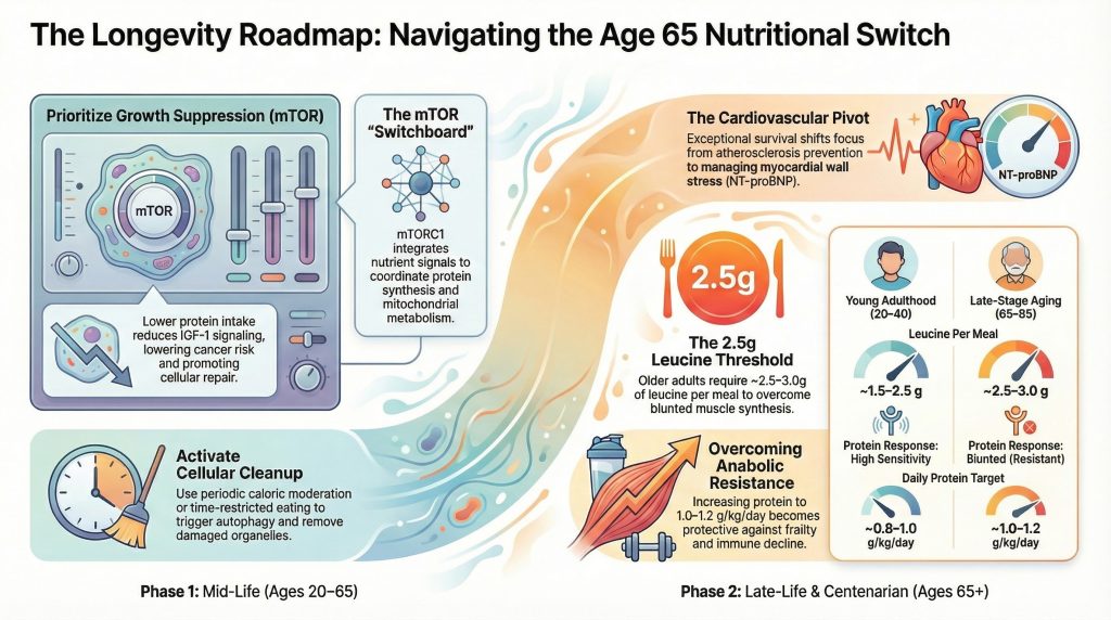 In summary, the transition to longevity is not about doing “more” of the same interventions forever; it is a calculated pivot from growth suppression and maintenance prioritization in midlife to structural preservation and anabolic support in later life. By understanding nutrient sensing (notably leucine thresholds and mTOR dynamics) and the mechanobiology of vascular aging, individuals and clinicians can better navigate the biological hurdles separating standard geriatric aging from resilient centenarian trajectories.