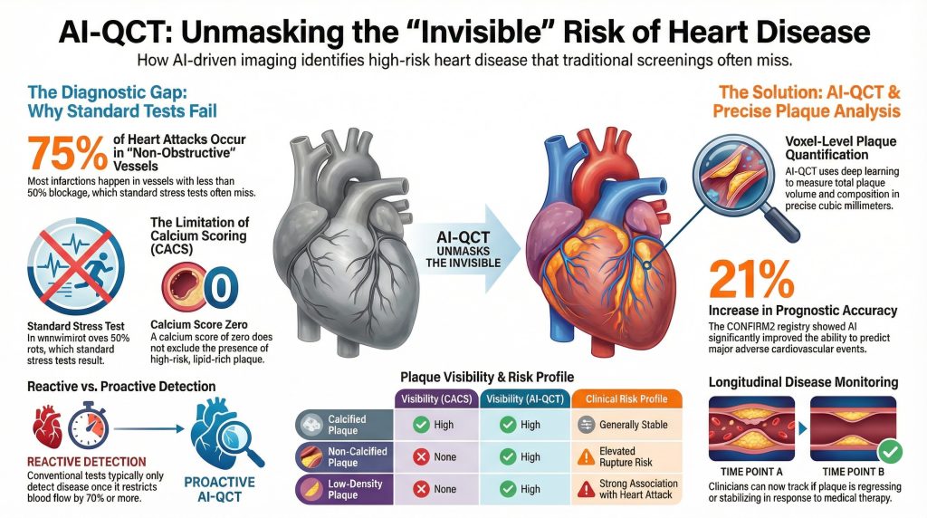 Cardiovascular medicine is undergoing a substantive paradigm shift, moving from a predominantly reactive, symptom-driven model toward a preventive framework grounded in early detection and individualized risk assessment. At the center of this transition is the integration of artificial intelligence (AI) with coronary computed tomography angiography (CCTA), particularly through the development of atherosclerosis imaging–quantitative computed tomography (AI-QCT). This approach addresses a long-standing limitation in cardiology: the inability of traditional diagnostic tools to reliably detect non-obstructive, lipid-rich coronary plaque, despite such lesions being responsible for the majority of acute coronary syndromes and sudden cardiac death events (1).
