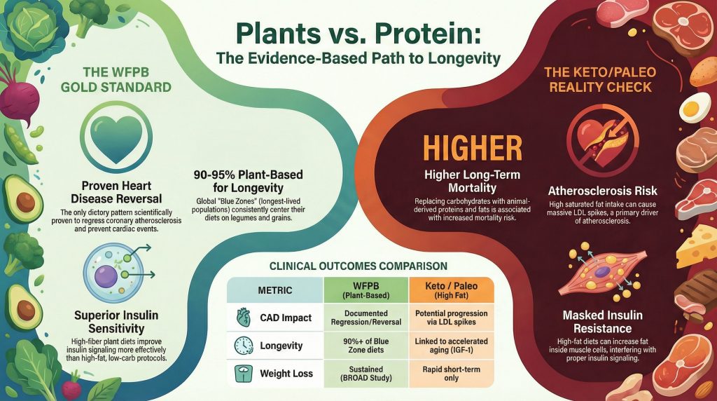 If the objective is the reversal of atherosclerosis and the maximization of lifespan, the evidence heavily favors a low-fat, whole food plant-based diet. While Paleo and Keto may provide temporary metabolic improvements via weight loss and carbohydrate restriction, they lack the proven track record for reversing our #1 killer—heart disease—and contradict the dietary patterns found in every long-lived population on Earth.